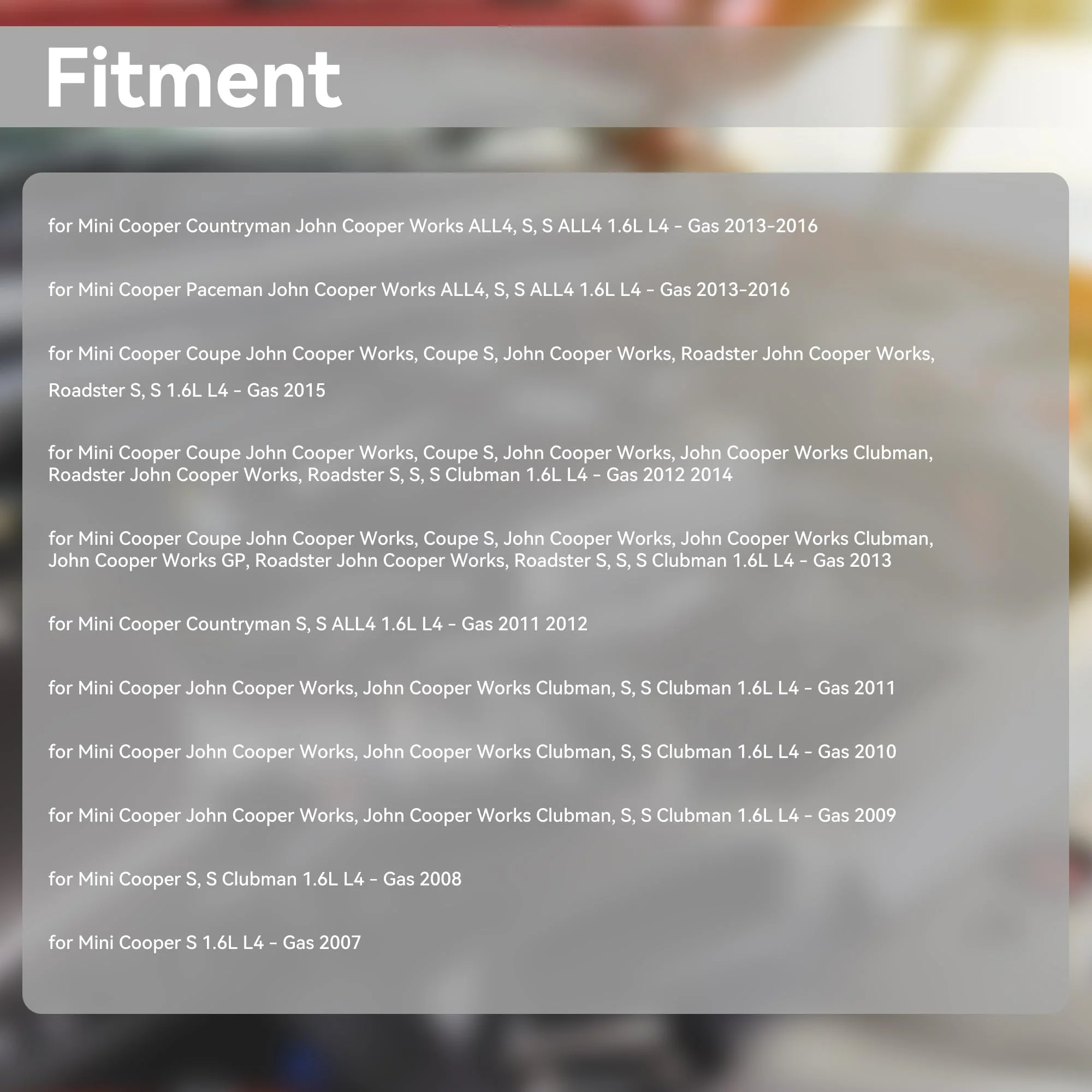 Fitment:for Mini Cooper Countryman Cooper Works ALL4, S, S ALL4 1.6L L4 – Gas 2013-2016, for Mini Cooper Paceman Cooper Works ALL4, S, S ALL4 1.6L L4 – Gas 2013-2016, for Mini Cooper Coupe, Coupe S, Roadster S, S 1.6L L4 – Gas 2015, for Mini Cooper Countryman S, S ALL4 1.6L L4 – Gas 2011 2012, for Mini Cooper S, S Clubman 1.6L L4 – Gas 2010, for Mini Cooper, S, S Clubman 1.6L L4 – Gas 2009, for Mini Cooper S, S Clubman 1.6L L4 – Gas 2008